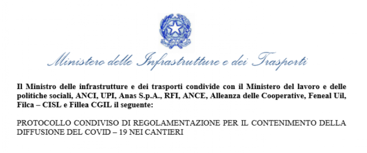 In data 24 aprile è stato pubblicato il nuovo Protocollo condiviso dal Ministero delle Infrastrutture e Trasporti con il Ministero del Lavoro, con ANCE, ANCI, UPI, Anas, RFI, Alleanza delle Cooperative, Feneal Uil, Filca Cisl e Fillea Cgil. Il Protocollo in questione richiama il Protocollo del 14 marzo, che riguardava tutte le attività produttive e lo integra sotto il profilo delle problematiche connesse al settore dell’edilizia ed ai cantieri in particolare. Rimandando ad una successiva circolare di approfondimento circa gli aspetti tecnici del Protocollo, che riguarda informazione, modalità di accesso dei fornitori esterni ai cantieri, pulizia e sanificazione nel cantiere, precauzioni igieniche personali, dispositivi di protezione individuale, gestione spazi comuni, organizzazione del cantiere, gestione di persone sintomatiche, sorveglianza sanitaria, aggiornamento del Protocollo, si segnala il paragrafo finale dedicato alla tipizzazione relativamente alle attività di cantiere delle ipotesi di esclusione della responsabilità del debitore, anche relativamente all’applicazioni di penali o di eventuali decadenze per omesso o ritardato adempimento.