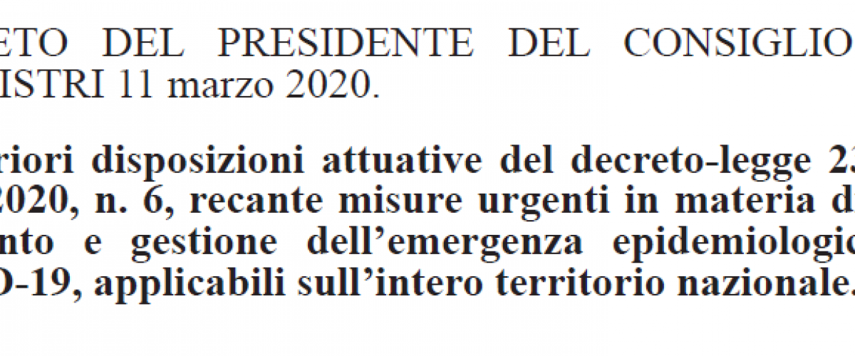 Pubblicato sulla Gazzetta Ufficiale n. 64 dell' 11 marzo 2020 il DPCM 11/03/2020 recante "Ulteriori disposizioni attuative del decreto-legge 23 febbraio