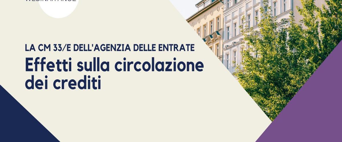 Il prossimo 27 ottobre alle ore 14.30 si terrà il webinar ANCE “La CM 33/E dell’Agenzia delle Entrate: effetti sulla circolazione dei crediti”