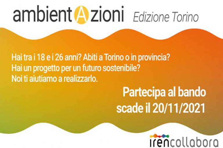 8 Settembre 2021 Bando AmbientAzioni 2021 - Edizione Torino Bando rivolto ai giovani di età compresa tra i 18 e i 26 anni promosso dal Comitato Territoriale Iren di Torino, nel quadro delle proprie finalità di realizzazione di iniziative concrete per la sos